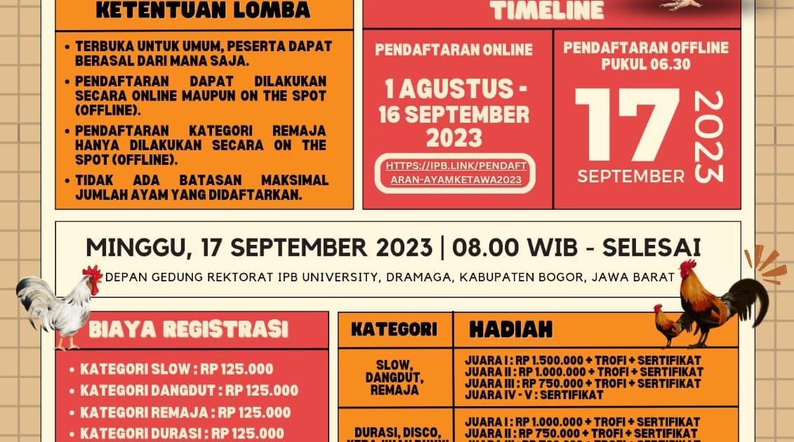 Kontes Ayam Ketawa Nasional 2023 merupakan ajang perlombaan dalam keindahan kokok ayam yang diselenggarakan secara offline pada tanggal 10 September 2023 bertempat di Telaga Inspirasi IPB University, Dramaga, Bogor .