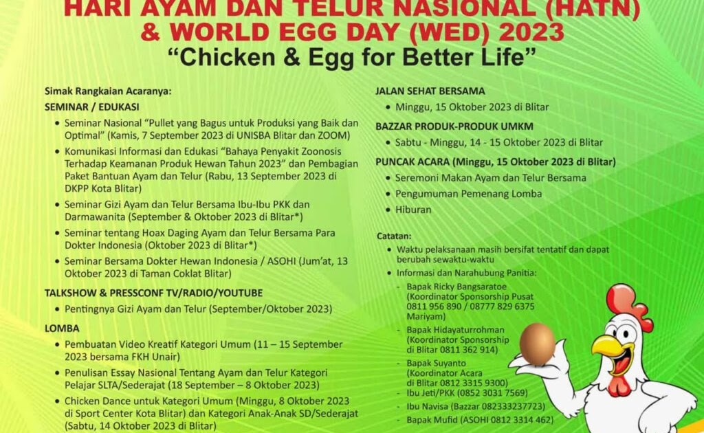 Sepanjang September hingga Oktober 2023, Kota dan Kabupaten Blitar, Jawa Timur, diramaikan dengan berbagai acara dalam rangka menyambut Hari Ayam dan Telur Nasional (HATN) ke-13 sekaligus perayaan Hari Telur Sedunia (World Egg Day).